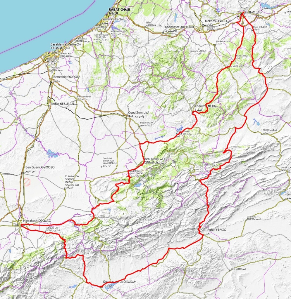 De eerste motorreis in Afrika! Vertrek op woensdag 12 april 2017 per Ryanair FR5851 om 7.40 uur uit Eindhoven. Door het tijdverschil komen wij al om 10.05 uur in Fez aan. Daar staat een behoorlijke rij bij de douane. De Amerikaan Dan Barnett van Motomaroc staat buiten op ons te wachten. Hij brengt ons naar hun locatie. Onderweg geeft hij wat tips over hoe om te gaan met het verkeer in Marokko. Op hun locatie ontmoeten wij ook Shan Gray en Rob Cullen. De wat oudere maar goed onderhouden GS’en staan op ons te wachten. Het is even wennen aan de andere bediening van de knipperlichten. Wij rijden Fez uit richting Ifrane langs chalets die in Oostenrijk niet zouden misstaan. Vanaf de afslag naar de Sources de L’Oum (P3100) wordt het een mooie en rustige weg. In Beni-Melal blijkt het door ons geboekte Hotel les Bellles Terasses prima te zijn. Zij serveren zelfs wijn (dat was wel de laatste alcohol deze reis……).