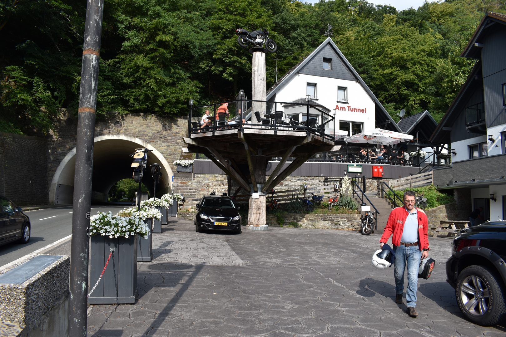 Vanaf vrijdag namiddag 6 juli 2018 (mij moesten eerst voldoende werkuren op de teller zetten…) tot en met zondag 8 juli reden wij rond Altenahr. Twee nachten in het bekende en herkenbare motorhotel Am Tunnel. Oftewel het hotel met de motor op de paal, vlak na (je raadt het al) de tunnel. In 2019 werd dit hotel helaas verkocht. En je ziet wat daar van komt, in juli 2021 werd het bij de overstromingen zwaar beschadigd.
