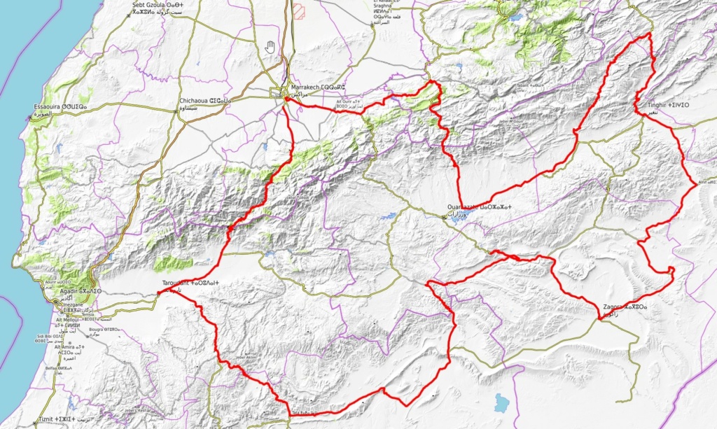 Woensdag 17 april met Transavia HV6533 (7.20 uur) naar Marrakech, aankomst 10.20 uur. Pas om 12.00 uur staan wij buiten de aankomsthal. Gelukkig staat Samir ons op te wachten. Hij moet even zoeken waar die loods met zijn motoren ook alweer gebleven is. De KTM’s zijn ook nog niet echt gereed. Uiteindelijk vertrekken wij met twee 1190 Adventures (Tommy en moi) en één 1290 Adventure (Maarten). Bij het uitrijden van Marrakech, het is al 15.00 uur, pompen wij eerst maar eens de banden op. Onderweg een bezoek aan de Mosquée de Tinmel, ca 100 km van Marrakech. En daarna de mooie Tizi-n-test pas op 2100 m. Bij de fraaie afdaling wordt het al schemerig. Onderweg boutjes gekocht om een bagagerek vast te zetten. De leatherman (don’t leave home without it!) biedt uitkomst. Bij de Riad Asma in Taroudent worden wij allerhartelijkst ontvangen. De Riad baas brengt ons ‘s-avonds zelfs met de auto naar het centrum en haalt ons daar weer op. Over gastvrijheid gesproken.